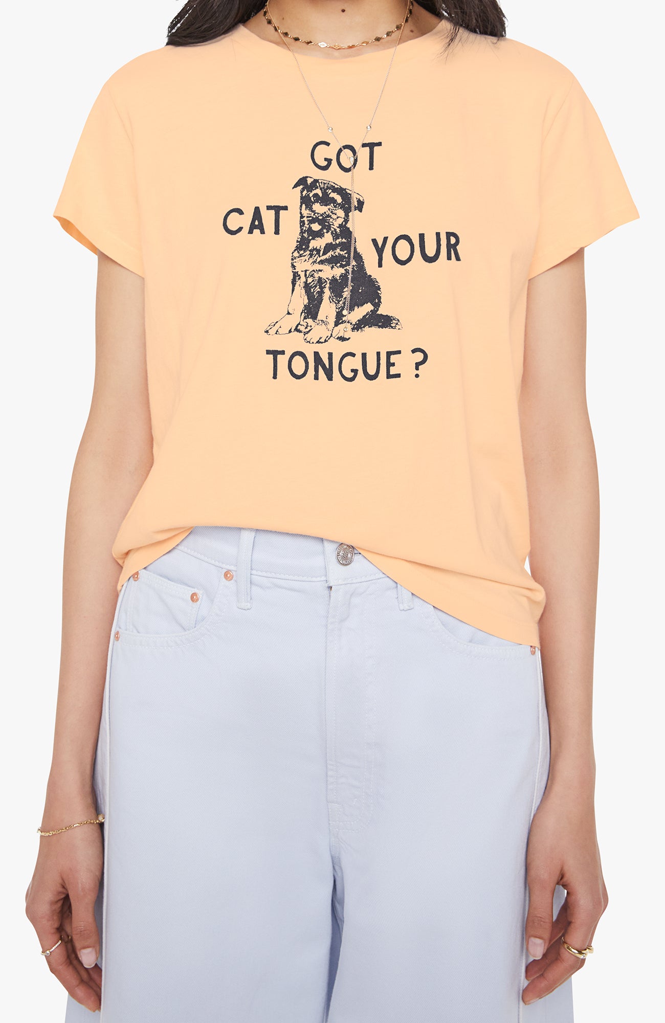 Tongue tied. A soft crewneck with a slim fit for a vintage look and feel. Made from 100% supima cotton in light peach, the tee features a black dog graphic with text on the front.