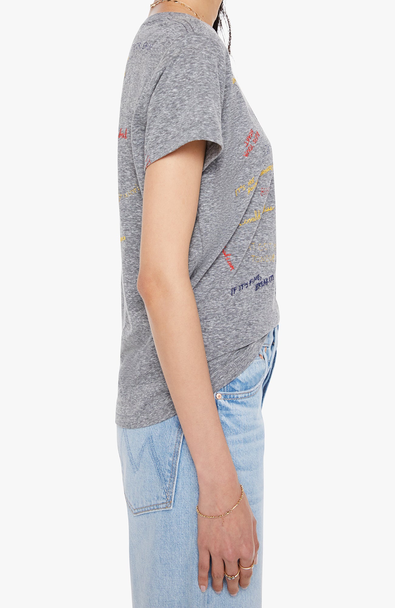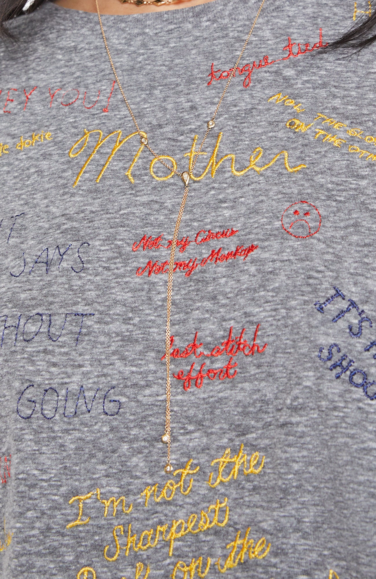 It says without going. A soft crewneck with a slim fit for a vintage look and feel. Made from a cotton blend in overdyed blue, The Boxy Goodie Goodie in Tongue Tied features printed text in red, yellow and blue throughout.