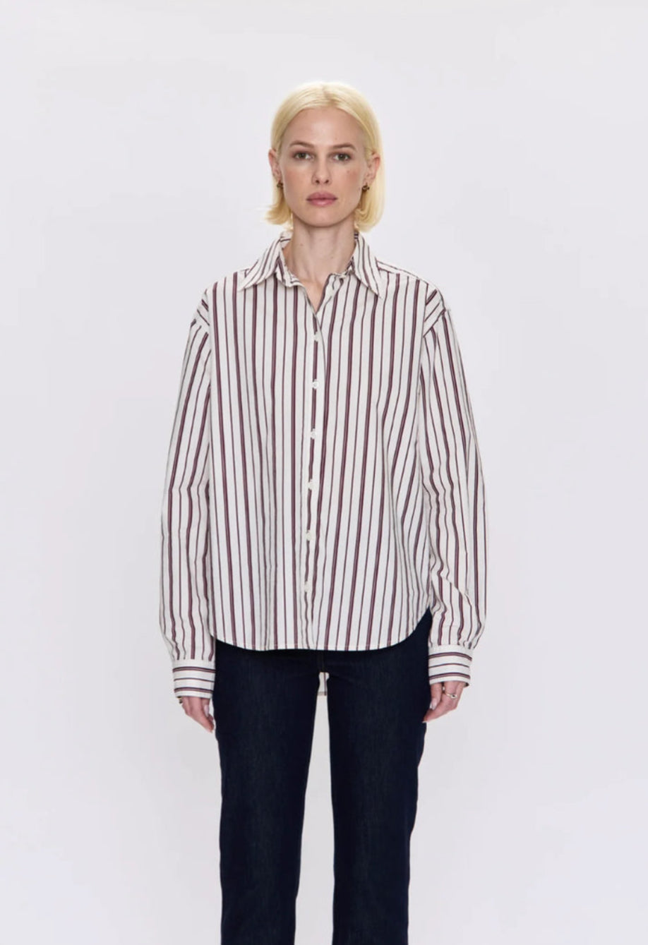 The button-up that proves effortless can still be elevated. Finlay reimagines the classic shirt in crisp cotton poplin with an oversized silhouette that layers with ease. Dropped shoulders and elongated proportions strike the perfect balance between relaxed and refined, while subtle tailoring keeps the shape intentional. Rendered in a Claret Stripe pattern, it brings a timeless touch to everyday dressing.